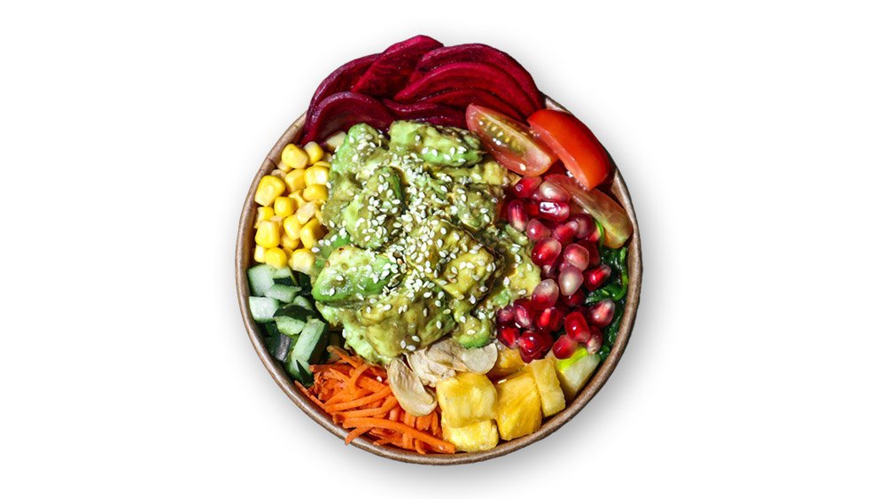 550 g, avokádový Shoyu poke s granátovým jablkem a prémiovou polevou. Sushi rýže, 7 lahodných přísad (okurka, řasa wakame, mrkev, cherry rajčátka, medový ananas, kukuřice a nakládaná červená řepa). Signature Umami Drizzle omáčka, smažená cibulka.