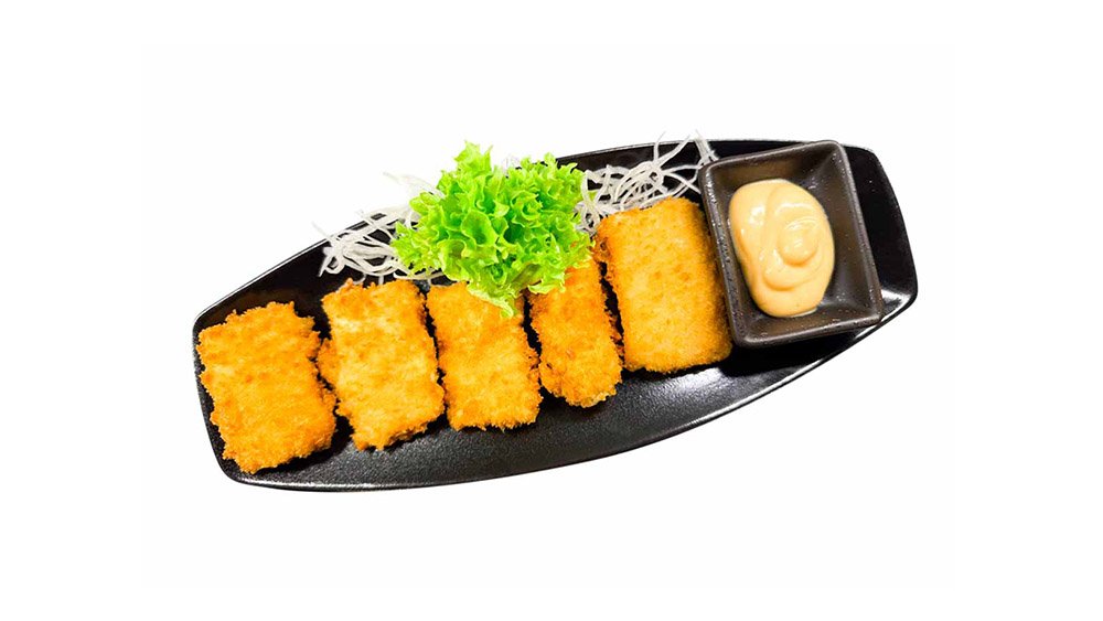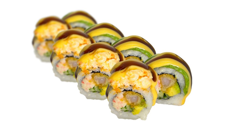 Uvnitř – Smažená kreveta v těstíčku, avokádo, okurka, krabí krém / Vně – Teriyaki omáčka, snow omáčka, tempura posyp, flambovaná omáčka (1, 2, 4, 7)
