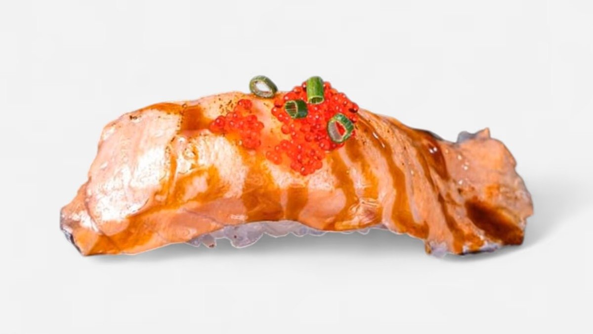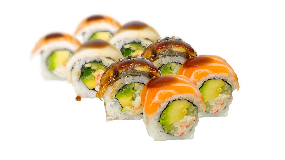 Aburi losos, avokádo, okurka, sójove boby, nakládaná ředkev, mrkev, seznam, koktejlová majonéza a teriyaki.