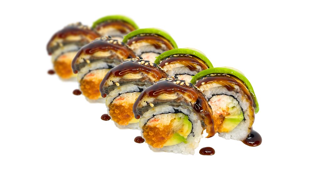 Uvnitř – BBQ úhoř, avokádo, okurka, krabí krém / Vně – Kreveta v koktejlové omáčce, kaviár z létající ryby, pažitka, C4 omáčka, snow omáčka, flambovaná omáčka (1, 2, 4)
