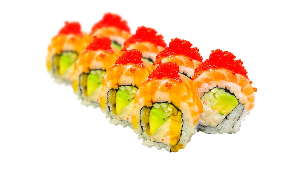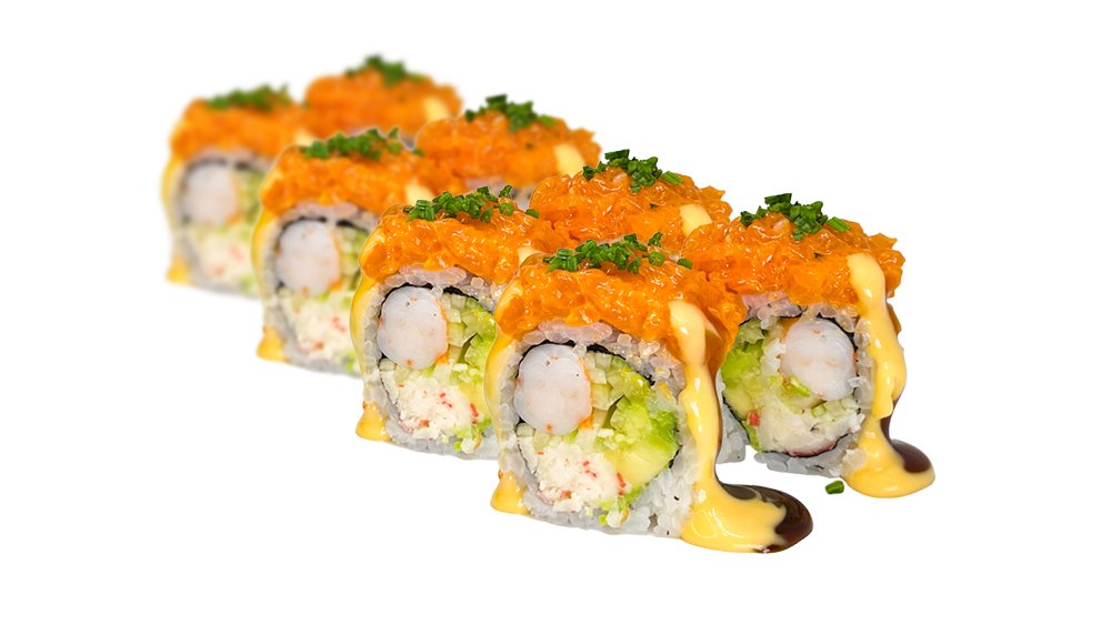 Uvnitř - Smažená kreveta v těstíčku, Philadelphia sýr, avokádo, okurka, krabí krém / Vně – Kaviár z létající ryby, tempura posyp, snow omáčka, pikantní omáčka, teriyaki omáčka, flambovaná omáčka (1, 4)