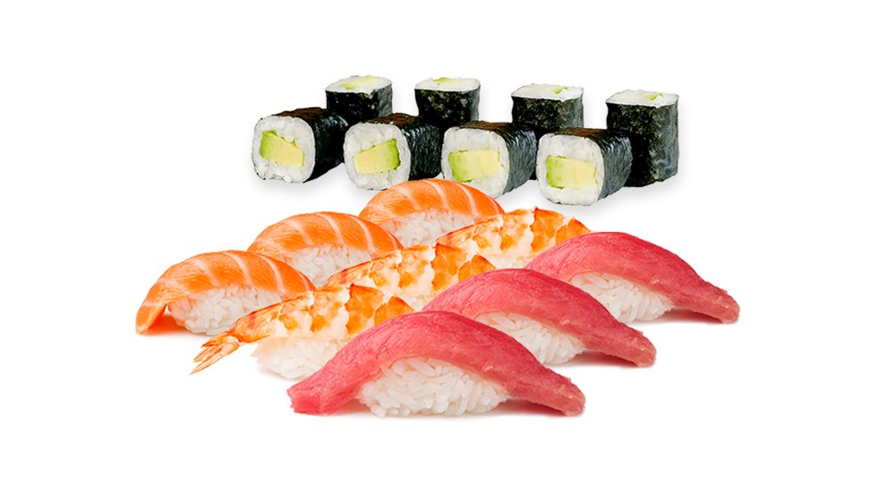 3ks nigiri losos, 3ks nigiri tuňák, 3ks nigiri krevety, 8ks maki avokádo