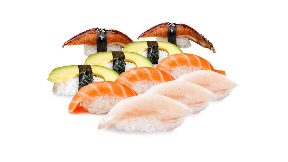 3ks nigiri máslová ryba, 3ks nigiri losos, 3ks nigiri avokádo, 2ks nigiri úhoř