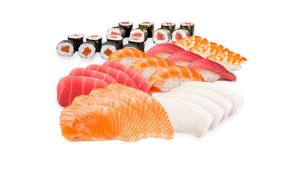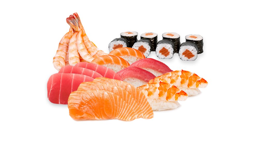 3ks sashimi losos, 3ks sashimi tuňák, 3ks sashimi kreveta, 2ks nigiri losos, 2ks nigiri tuňák, 2ks nigiri krevety, 8ks maki losos