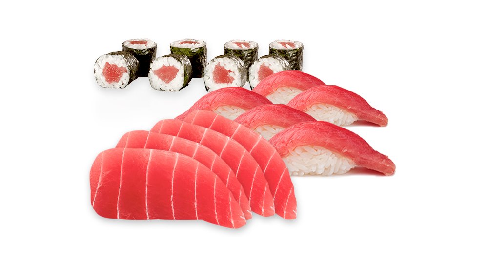 4ks sashimi tuňák, 5ks nigiri tuňák, 8ks maki tuňák