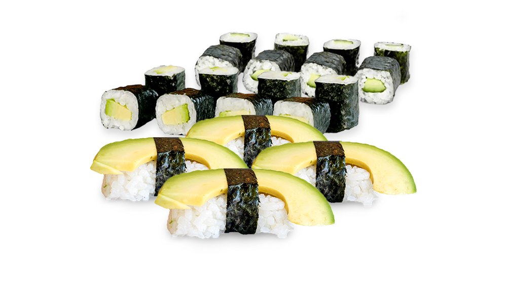 4ks nigiri avokádo, 8ks maki okurka, 8ks maki avokádo