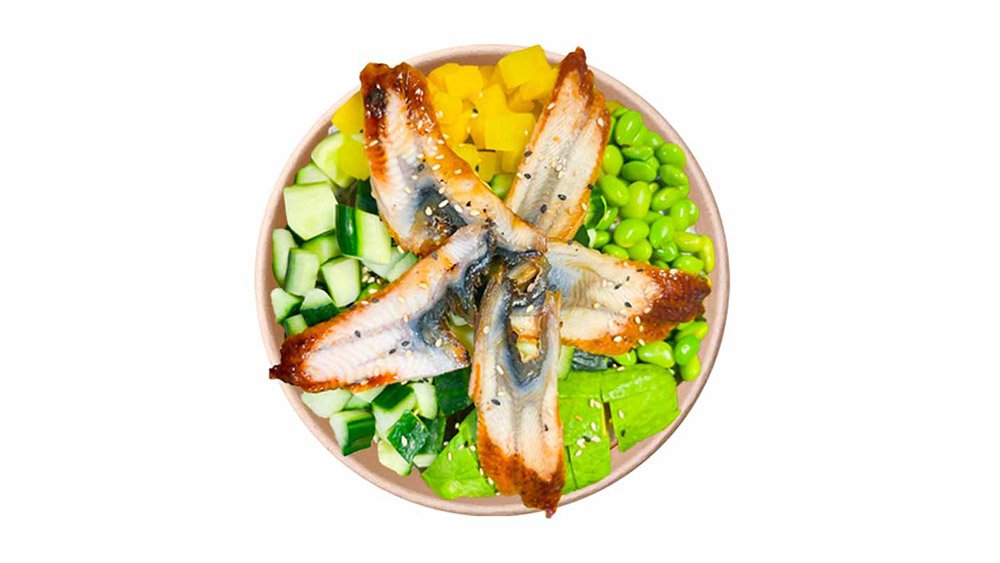 Unagi Aburi, avokádo, sójové edamame, nakládaná ředkev, okurka, sezam, teriyaki omáčka, japonská rýže.