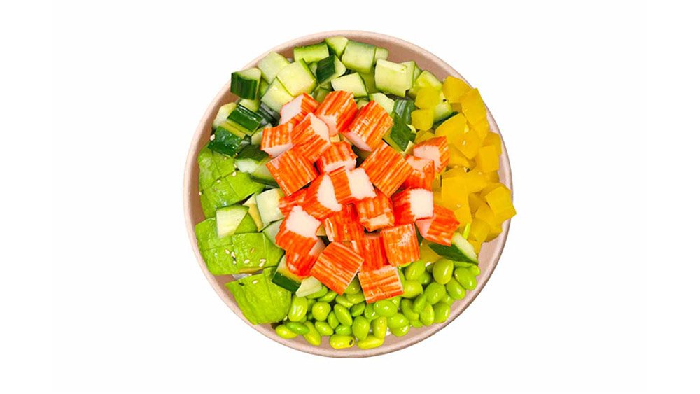 Surimi, avokádo, sójové edamame, nakládná ředkev, okurka, sezam, koktejlová majonéza, teriyaki omáčka, japonská rýže.