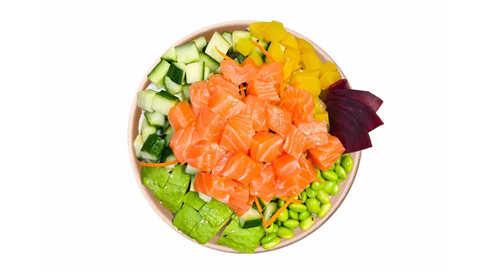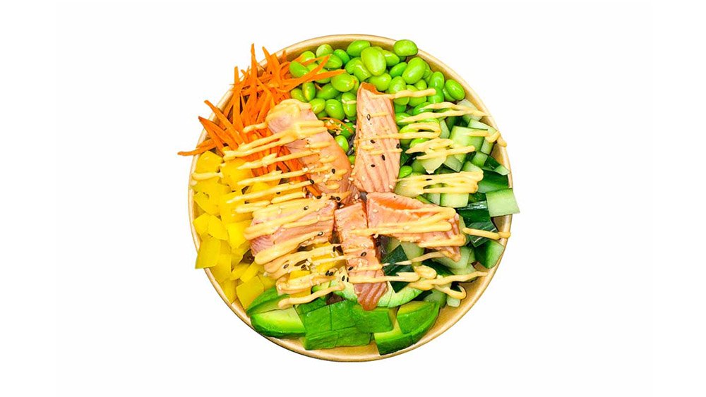 Miska s kousky lososa, okurka, sójové boby edamame, avokádo, nakládaná ředkev, rukola, koktejlová majonéza, teriyaki omáčka, japonská rýže,