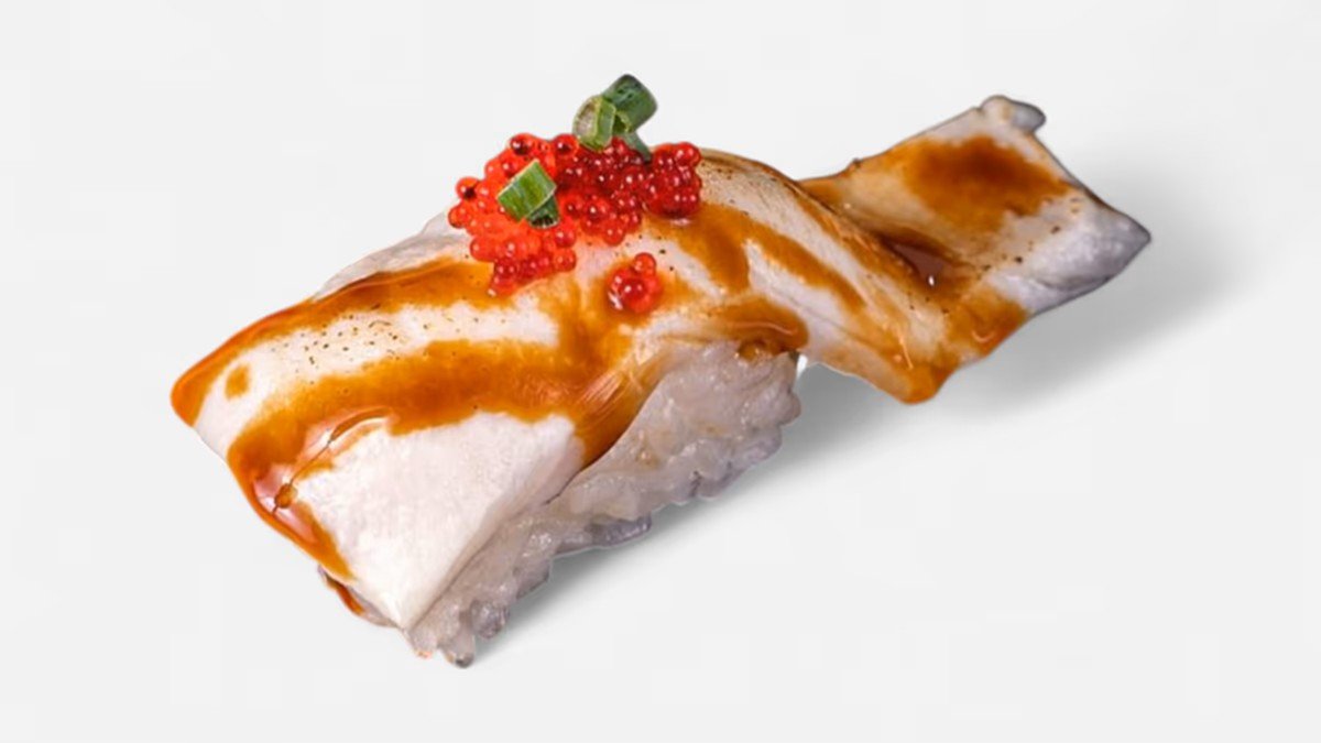 Uvnitř – Pikantní tuňák, avokádo, okurka, krabí krém / Vně – BBQ úhoř, avokádo, sezam, teriyaki omáčka (1, 4, 6, 11)