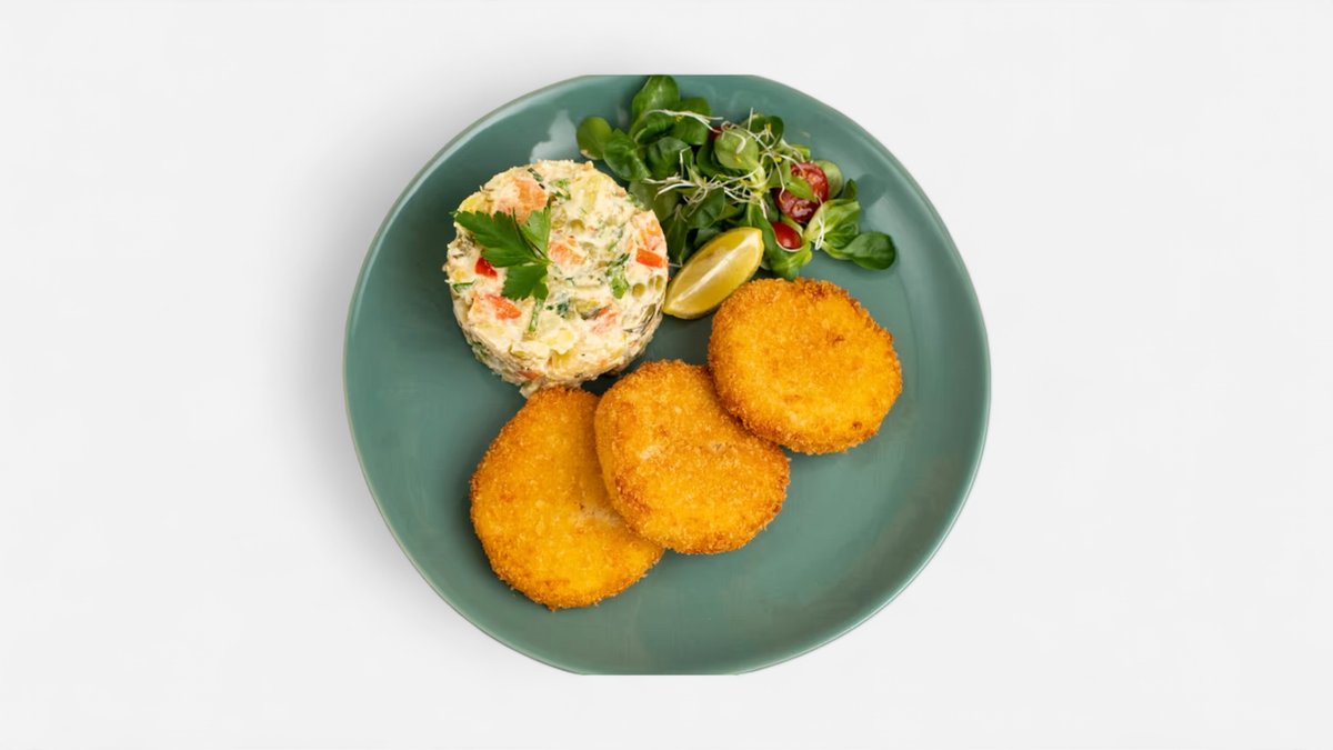 Smažený celerový řízek, bramborový salát, salátek a citron (1,6,9)