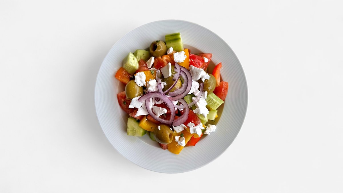 Řecký salát s olivami, okurkou,paprikou,rajčatem,červenou cibulkou,