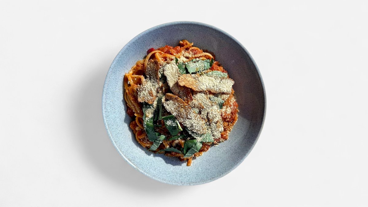 Linguine s čočkovou bolognese omáčkou,tempehovou slaninkou,