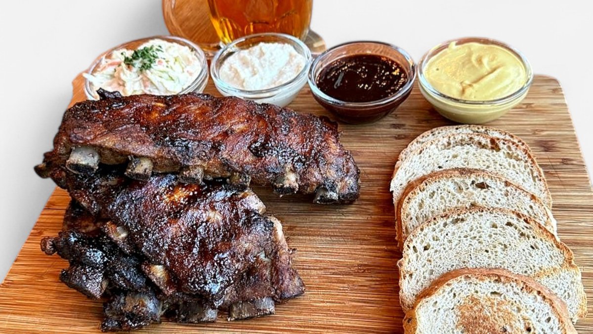 800g Marinovaná pečená vepřová žebra, domácí kmínový chléb, salát Coleslaw, hořčice, křen, BBQ omáčka