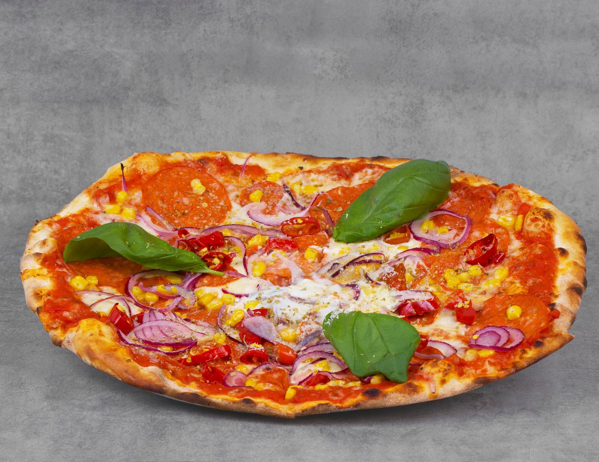 tomato, mozzarella, salám, cibule, feferonky, kukuřice vejce