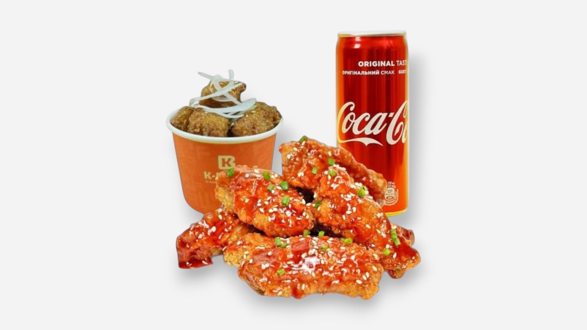 6 kuřecích křídel s česnekovo-sojovou omáčkou, coca cola 330ml, hranolky