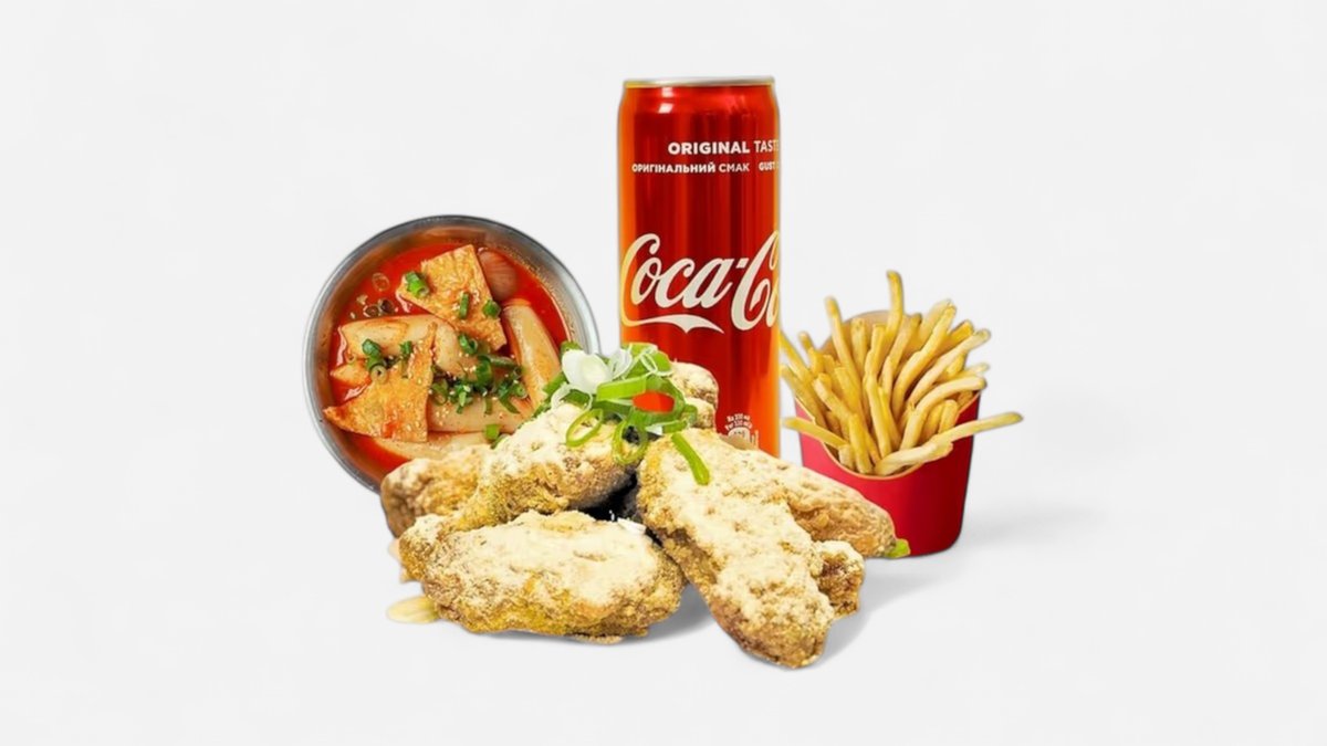 6 Křídelky Cheese, Tteokbokki, Malé Hranolky, Coca 0,33l