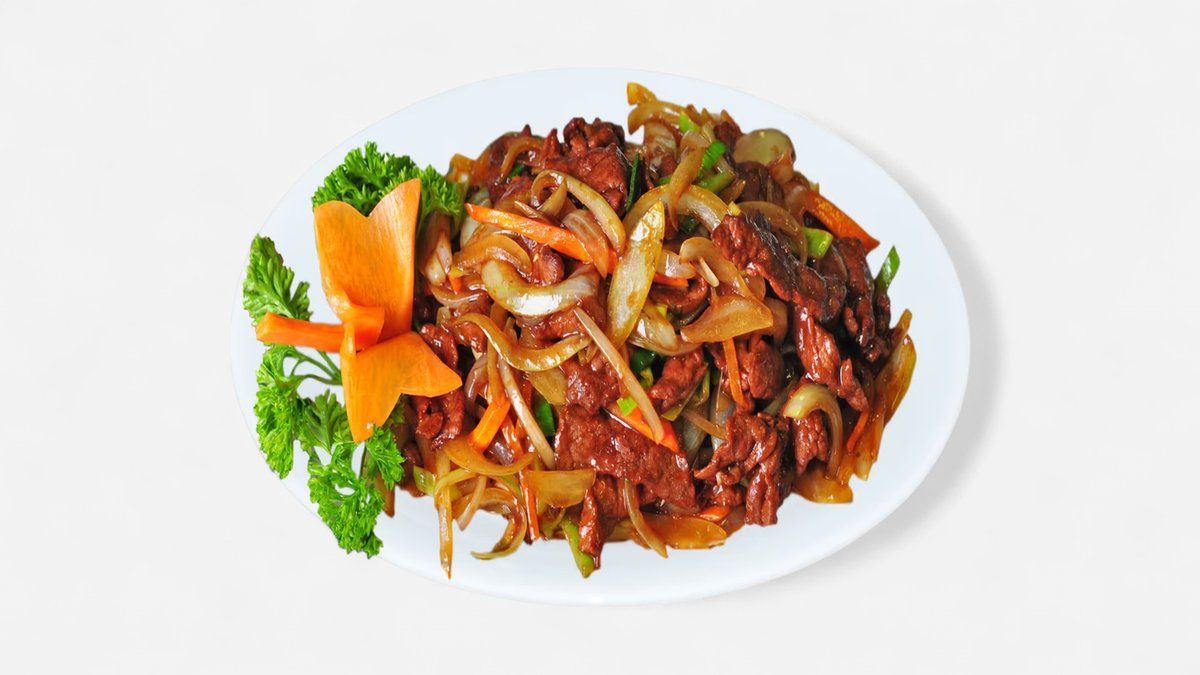 silná palačinka restovaná na pánvi se zeleninou, tofu a plátky hovězího masa