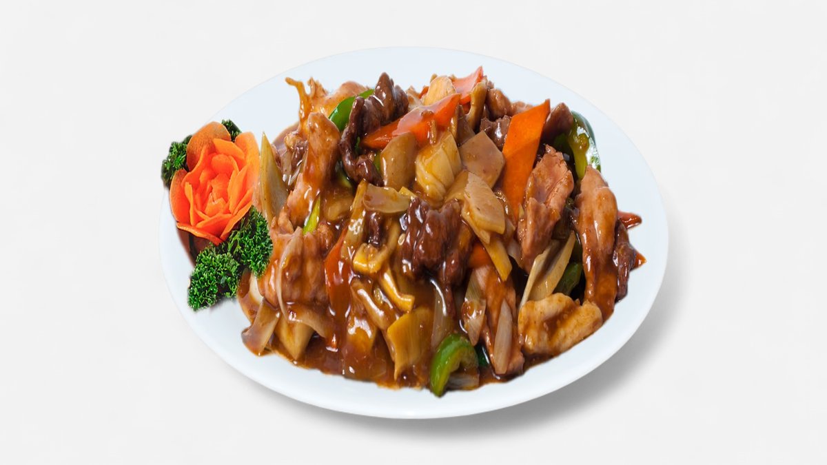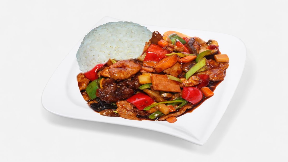 připravena z mořských plodů, kalamárů, měkkého tofu, vejce, cukety, cibule, podáváno s miskou bílé rýže