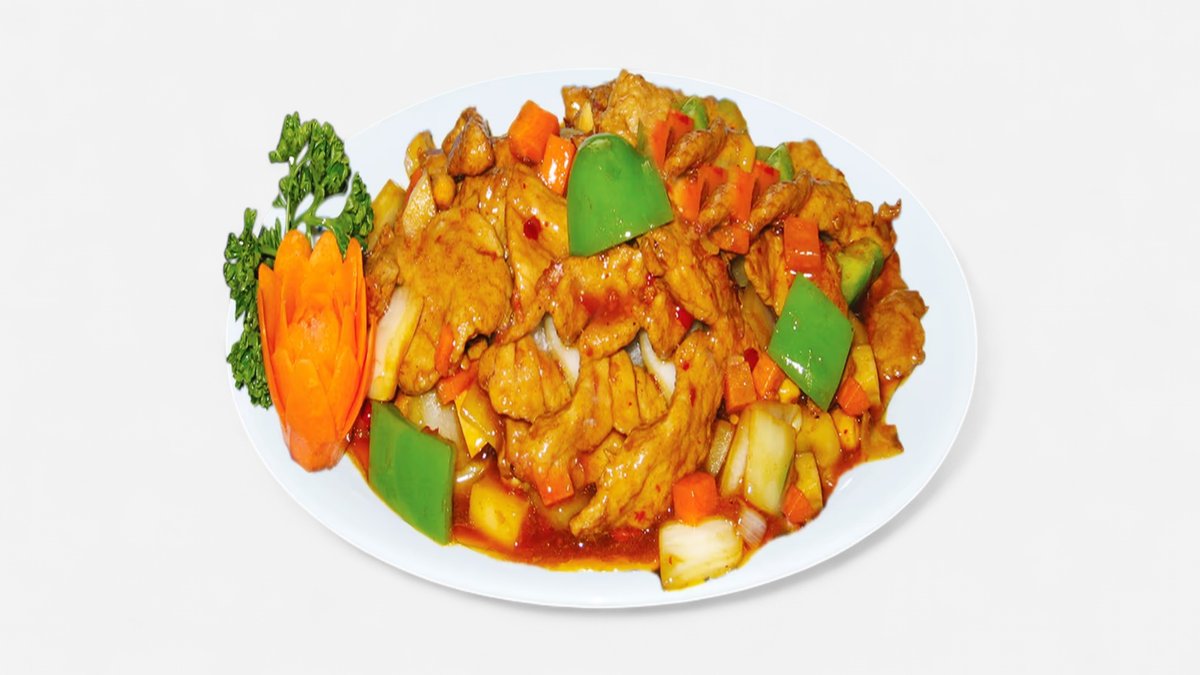 - Vepřové maso, brambory, mrkev, kari, rýže