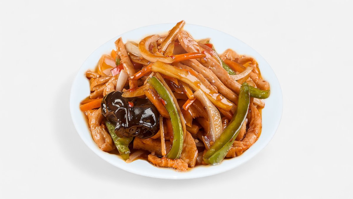 Rýže, vepřové maso, kalamáry, mrkev, cibule, chilli omáčka, plátek sýra