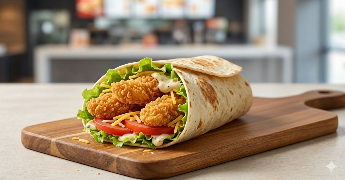 Šťavnatý kuřecí wrap s křupavými stripsy! Tři jemné kuřecí stripsy, čerstvý ledový salát, zralé rajče a aromatická tatarská omáčka — vše zabalené v měkké tortille a upečené na grilu pro ideální zlatou kůrčičku. Ideální volba pro rychlý a chutný snack