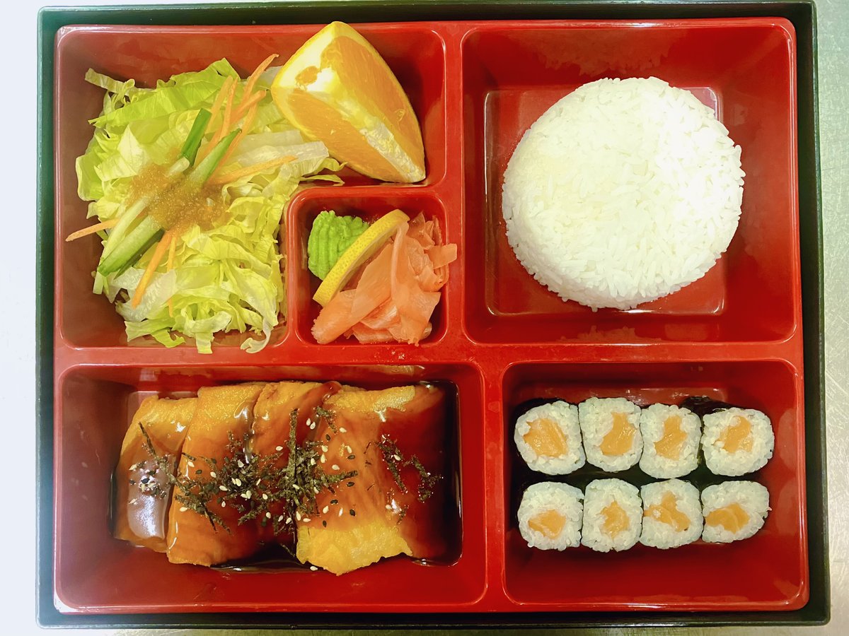 Grilovaným losos s teriyaki ,sushi maki losos 8 ks, salát ,rýže ,ovoce .
