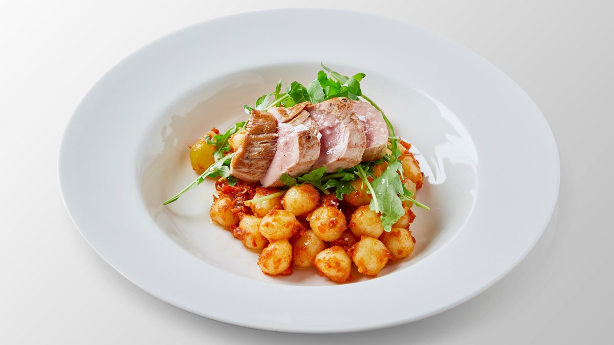 Bramborové nočky s kuřecími prsíčky s pestem ze sušených rajčat a rukolou, 100g