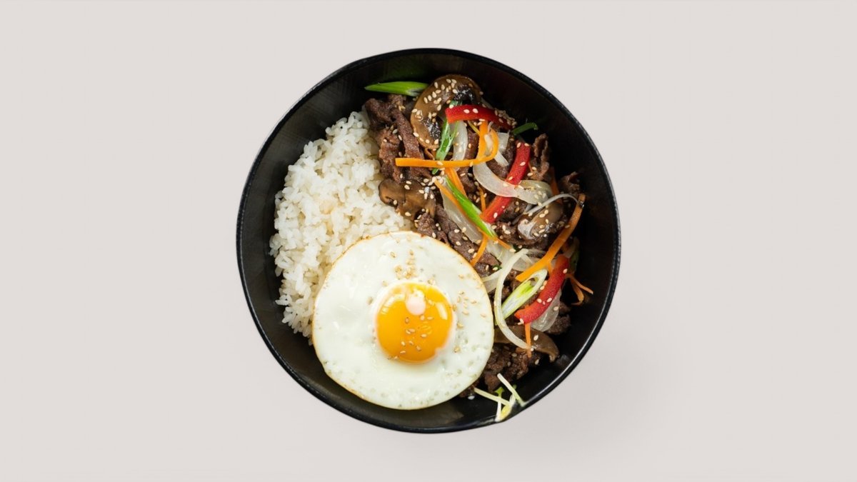 stir-fried thin sliced meet marinated sweet soy sauce with paprika, carrot, green onoion, onoion, mushroom + spicy pickle, salad and sunny side up egg