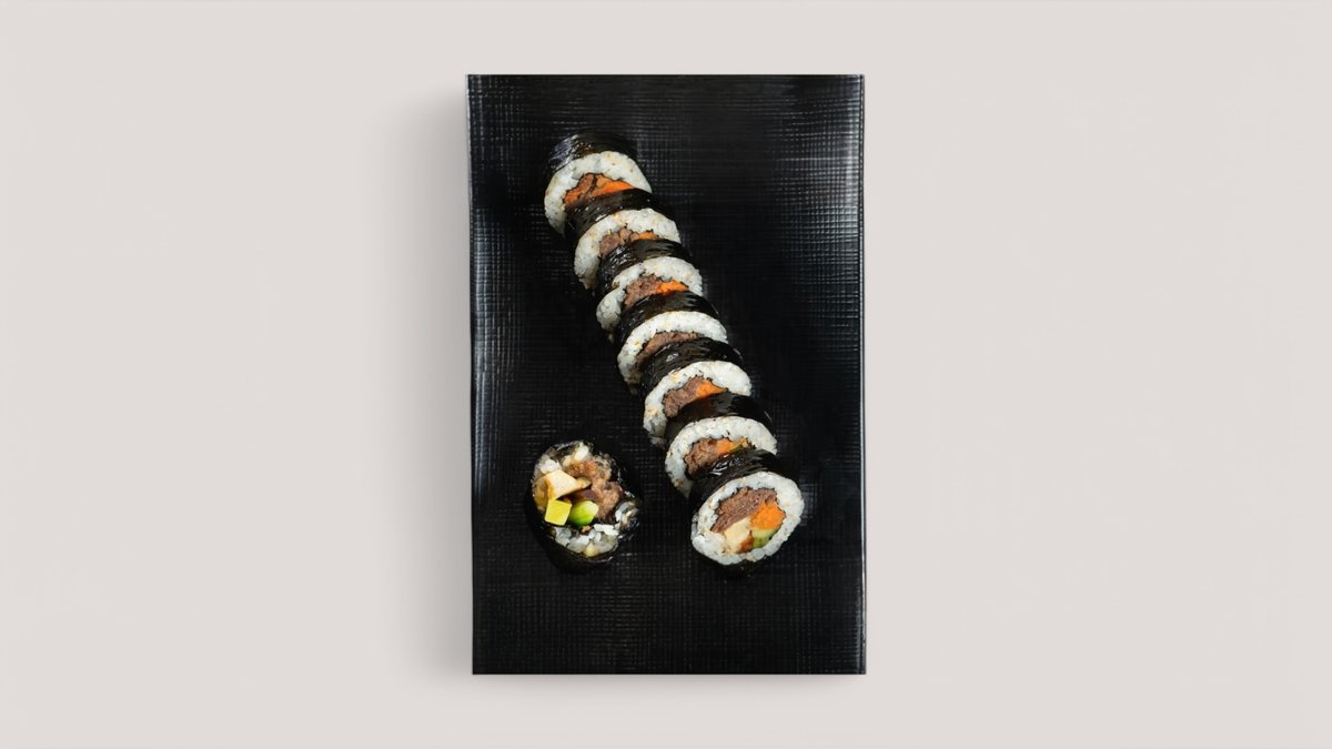 dried seaweed wrapped roll with marinated meet, yellow radish, burdock, carrot, spinach and egg