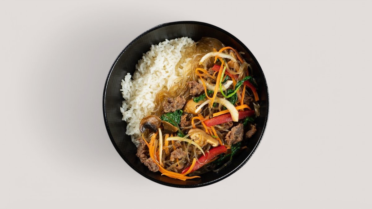 glass noodles (with rice) - beef, peppers, spinach, carrots, mushrooms, onions