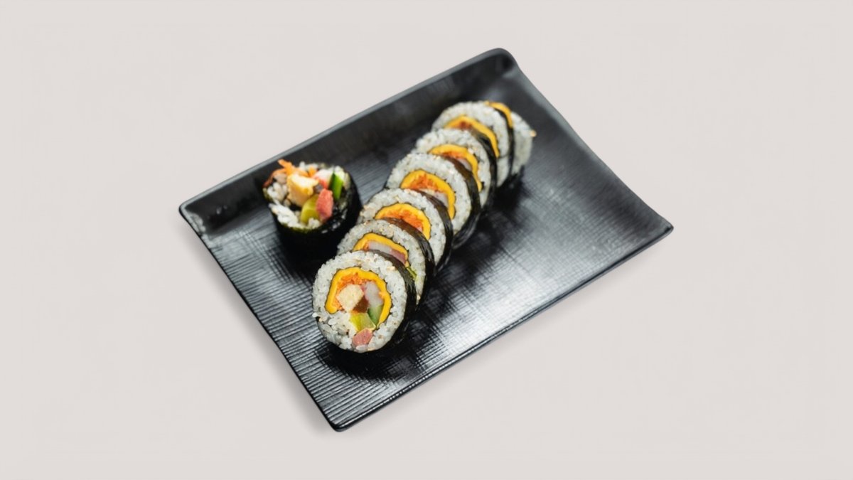 dried seaweed wrapped roll with chicken sausage, yellow radish, burdock, carrot, spinach, crab stick and egg