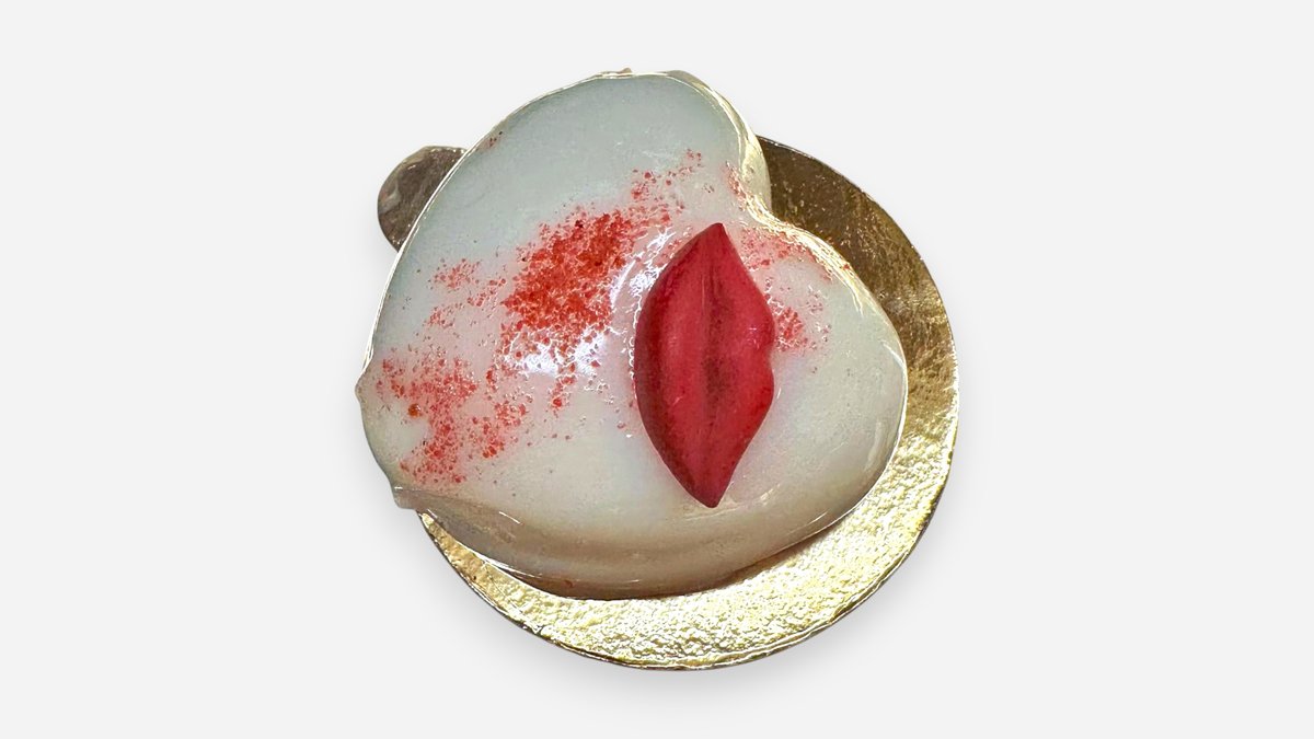 Lehký světlý korpus s nadýchaným krémem, zahalený do hladkého sytě červeného glasse. Smyslný dezert s krémovou texturou a jemně sladkou chutí s ovocným nádechem. Light sponge cake with airy cream, wrapped in a smooth deep red glaze. A sensual dessert with a creamy texture and gently sweet flavour with a hint of fruit.