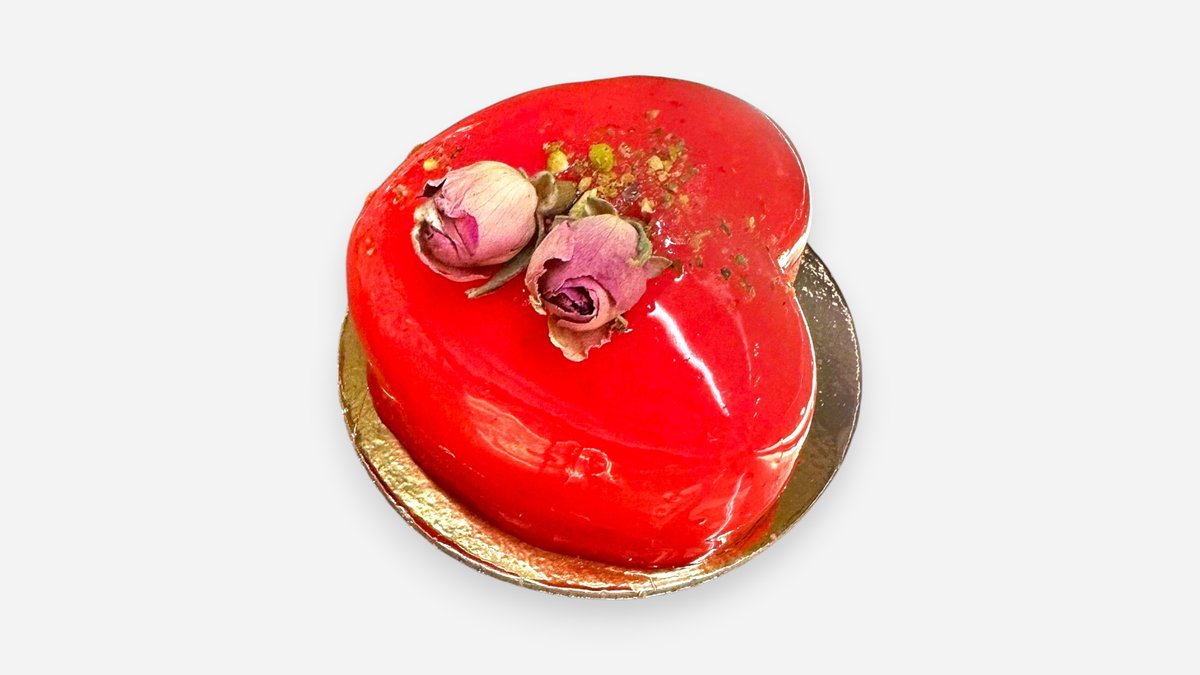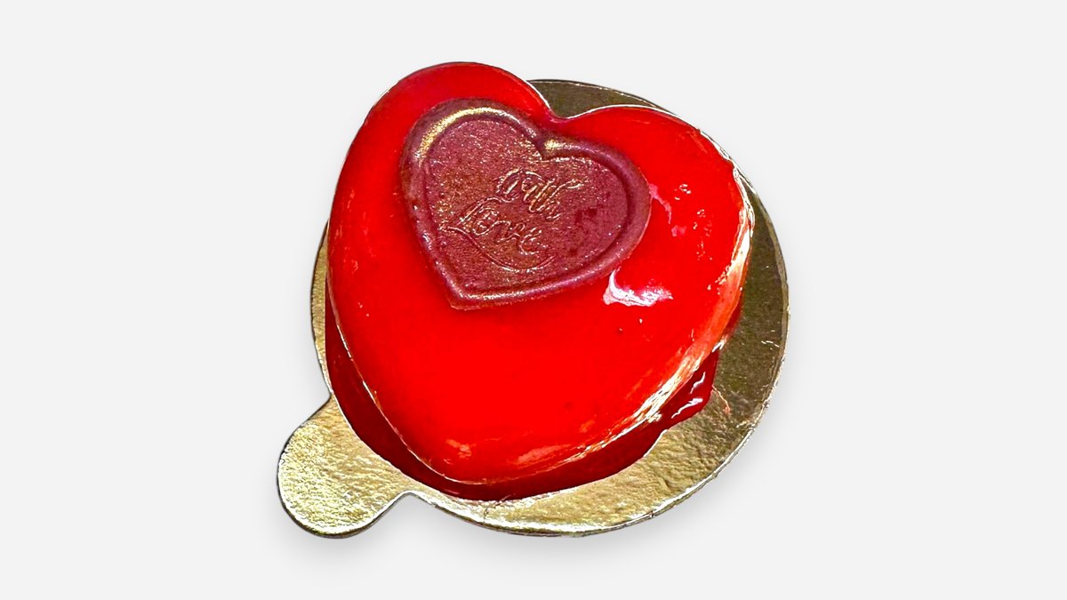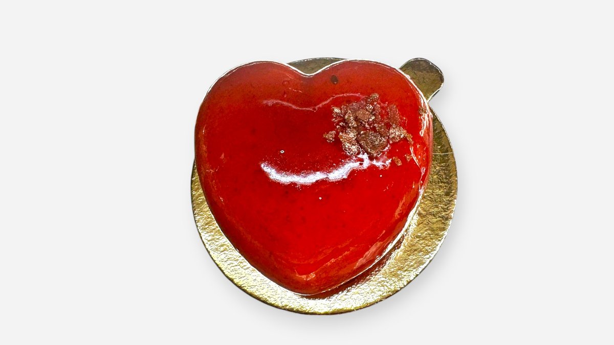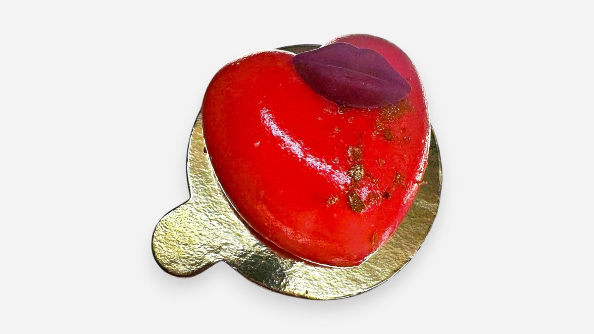 Světlý korpus s nadýchaným krémem a malinovým srdcem uvnitř, obalený v hladkém červeném glasse. Sladký sen s příjemnou ovocnou svěžestí. Light sponge cake with airy cream and a raspberry heart inside, coated in a smooth red glaze. A sweet dream with a pleasant touch of fruity freshness.
