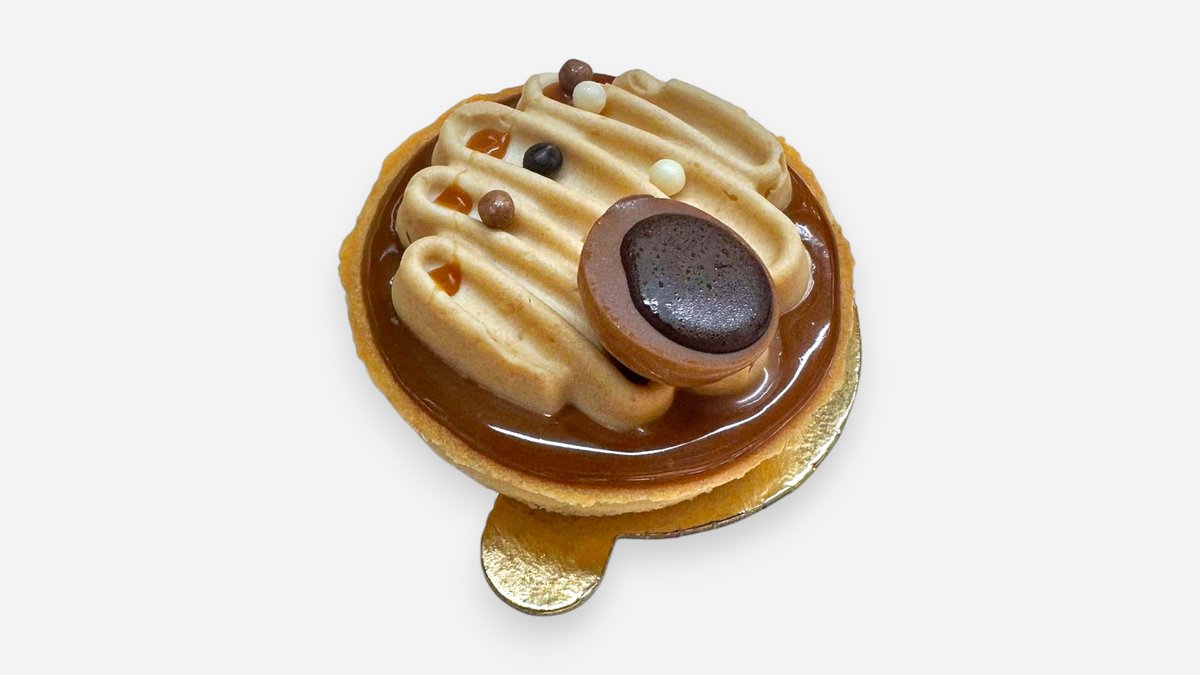 Křehká máslová tartaletka plněná sametovým žloutkovým krémem s lískovými oříšky a karamelem, zdobená jemnou vlnkou karamelové šlehačky. Bohatý, hebký dezert s výraznou karamelovou tečkou. Caramel Tartlet A crisp buttery tartlet filled with a velvety egg yolk cream with hazelnuts and caramel, finished with a delicate swirl of caramel whipped cream. A rich and indulgent dessert with deep caramel notes.