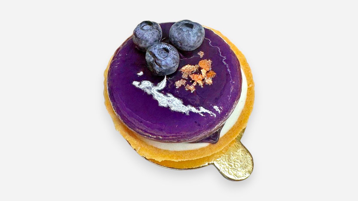 Křehká máslová tartaletka plněná hedvábně jemnou tvarohovou šlehačkou s borůvkovým pyré. Lehký, svěží dezert, kde se snoubí krémová jemnost s ovocnou šťavnatostí. A delicate buttery tartlet filled with silky smooth whipped quark cream infused with blueberry purée. A light and refreshing dessert where creamy softness meets juicy fruit notes.