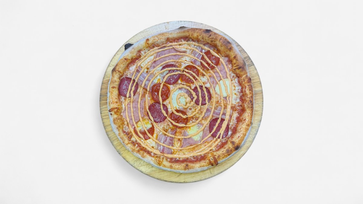 smetanový základ, mozzarella, salám, slanina, jalapeňo papričky, cibule, kukuřice |A 7|