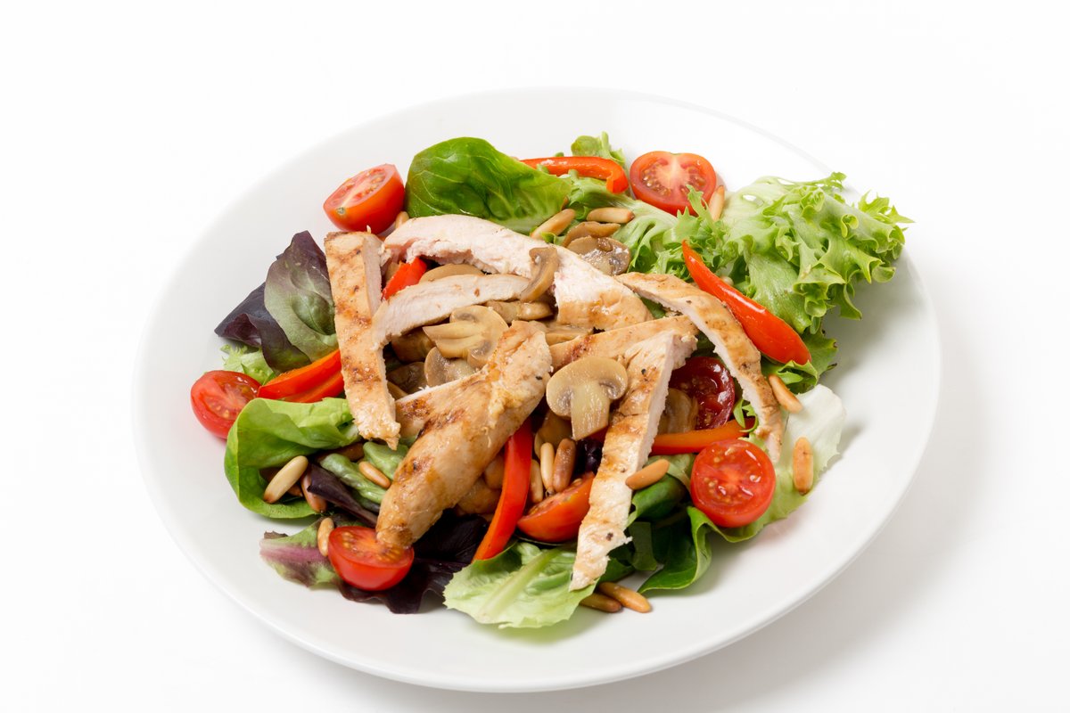 salát z římského salátu a krutonů s kuřecím masem, slaninou, rajčatky cherry, parmezánem, citronovou šťávou, vinným octem, olivovým olejem, česnekem, worcestrovou omáčkou a černým pepřem, 450g
