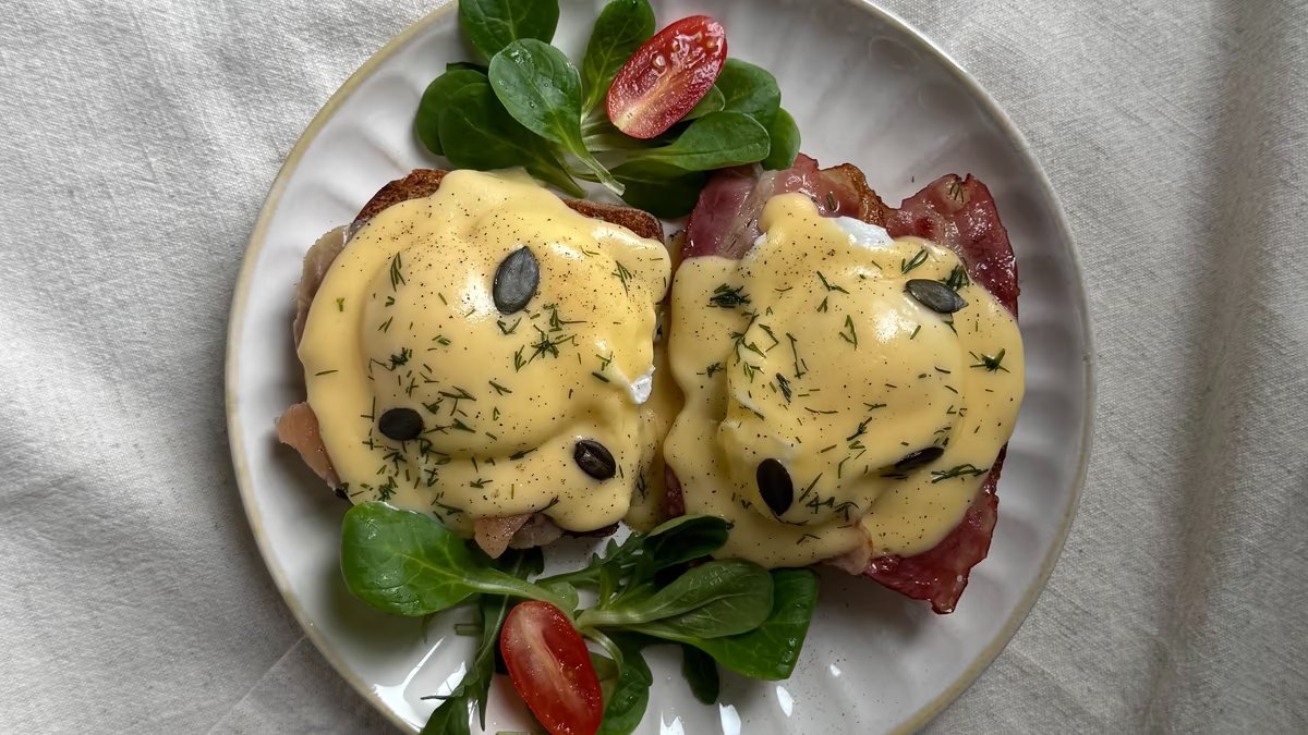 "Celozrnný chléb s pošírovanými vejci, polníčkem a jemnou holandskou omáčkou. Klasicky podáváme s avokádem, ale nabízíme také variantu se slaninou nebo jemně soleným lososem."