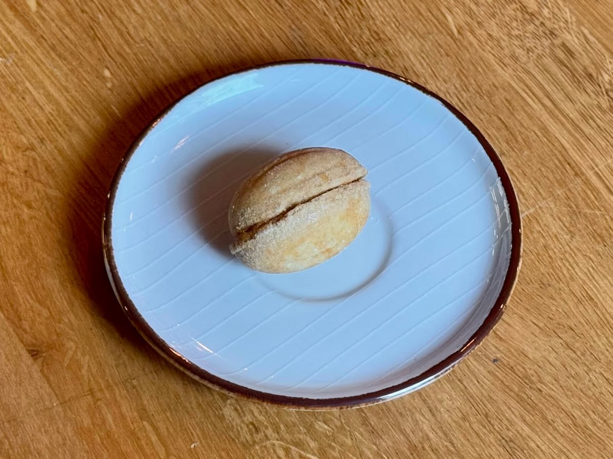 "Oříšek s karamelovým salkem Lahodný křehký dezert ve tvaru oříšku, plněný jemným a sladkým karamelovým kondenzovaným mlékem."