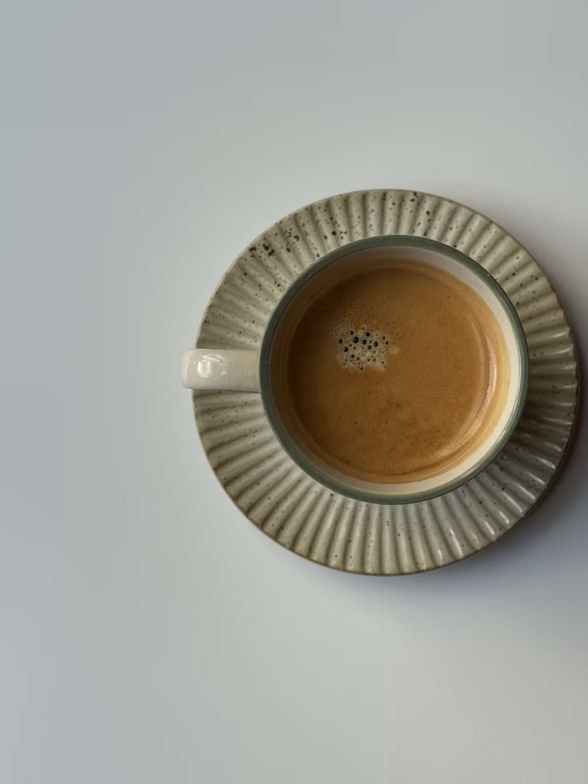 "Espresso s kopečkem napěněného mléka nahoře Misto puvodu : Brazilie. 100% arabica. Stredni praženi"