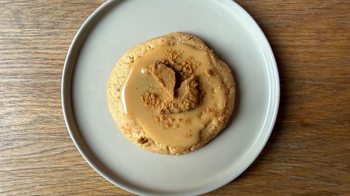 "Velká, měkká sušenka s karamelovou chutí sušenek Lotus Biscoff. Těsto je připravené z másla a kombinace bílého a třtinového cukru, díky čemuž je cookie jemná a vláčná. Uvnitř jsou kousky sušenek Lotus, nahoře vrstva karamelového Salko a sušenky Lotus jako dekor. Sladká, karamelová a krémová, s měkkým středem a lehce křupavými okraji."