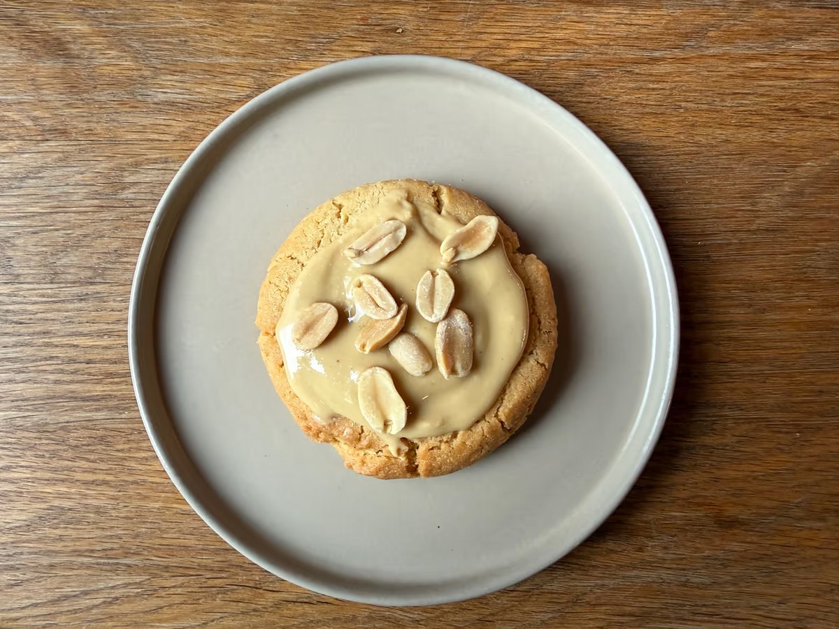 "Velká, měkká sušenka s výraznou chutí arašídového másla. Těsto je připravené z másla, 100% arašídové pasty a kombinace bílého a třtinového cukru, díky čemuž je cookie jemná, vláčná a přirozeně sytá. Uvnitř jsou kousky pražených arašídů, nahoře vrstva arašídové pasty a nasekané arašídy jako dekor. Krémová, oříšková a lehce sladká, s měkkým středem a jemně křupavým povrchem."