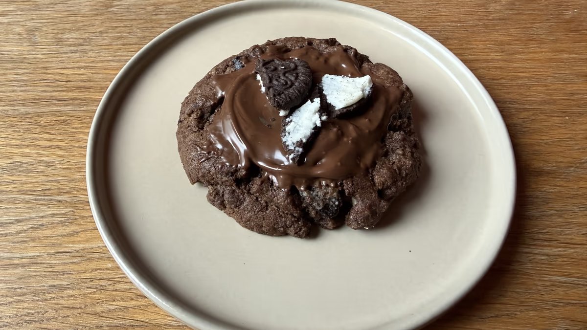 "Oreo Cookie Velká, měkká čokoládová cookie s kousky sušenek Oreo uvnitř. Těsto je připravené z másla, kvalitního kakaa a kombinace bílého a třtinového cukru, díky čemuž má sušenka výraznou chuť a vláčnou strukturu. Uvnitř jsou nasekané Oreo bez krému, nahoře je vrstva čokoládové pomazánky a kousky Oreo jako dekor. Sytá, čokoládová a jemně křupavá na okrajích, měkká uvnitř."