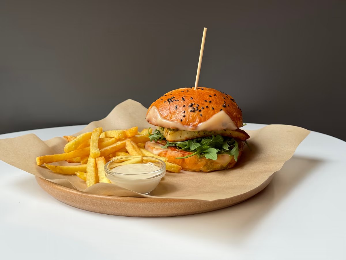 Vegan burger hranolkami (vlastně udělaná brioška, halloumi, barbecue omáčka, sýr, ledový salát, marinované okurky)