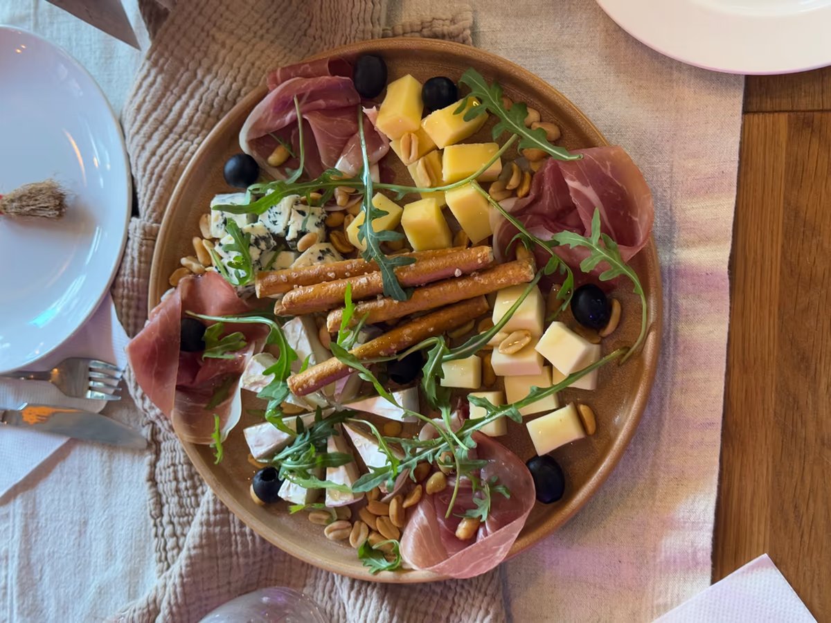 4 druhy sýru, Prosciutto, olivy, grissini, ořechy, italsky mix salatu, extra panenský olivový olej