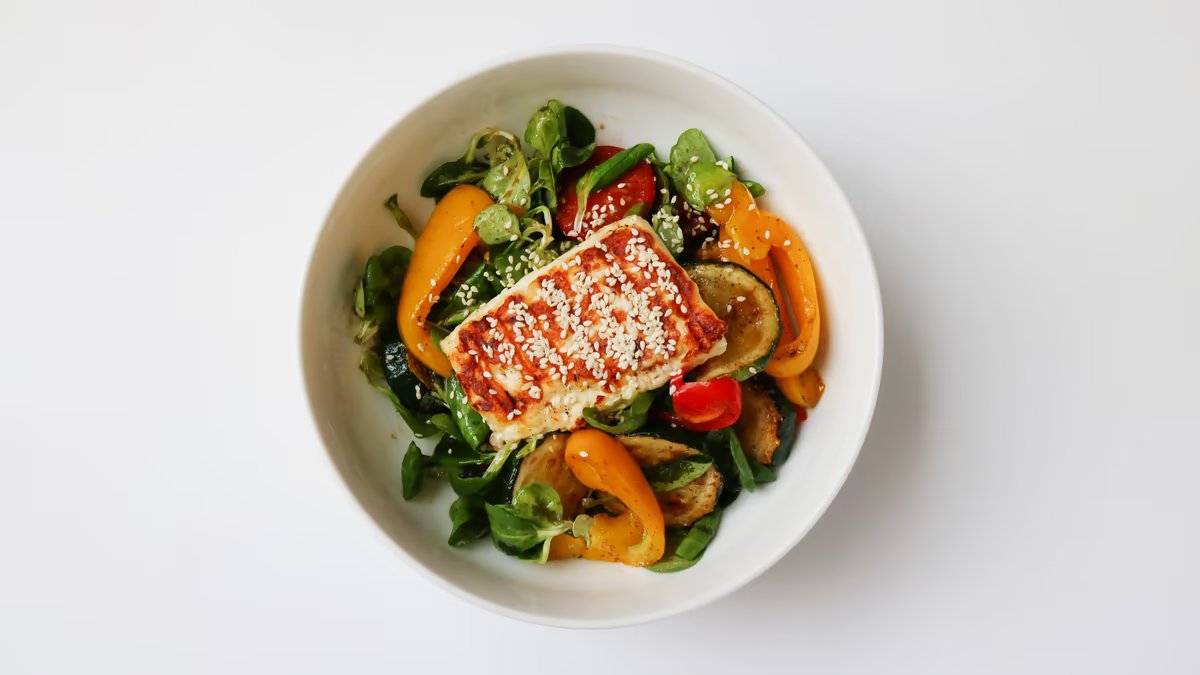 Teplý salát s grilovanou zeleninou a halloumi (paprika, rajčata, cuketa, polníček, halloumi, dresink