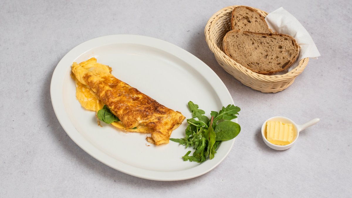 Omeleta s chorizem, goudou, rukolou a smaženou cibulkou