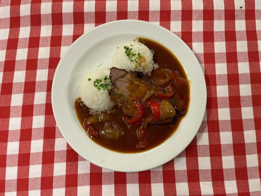 5. 120g. Vepřový plátek na žampiónech, rýže