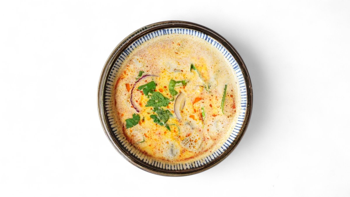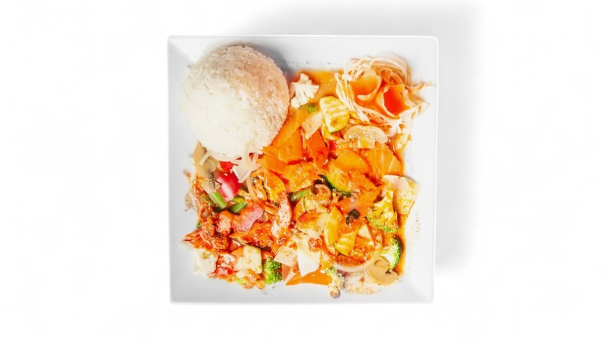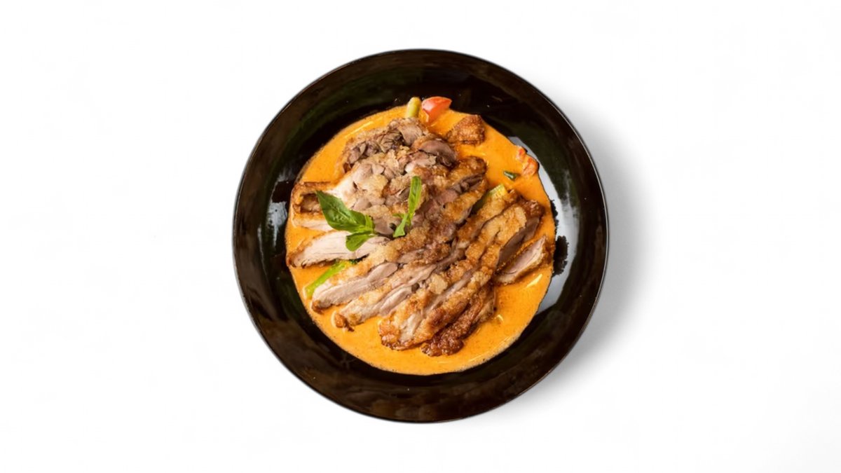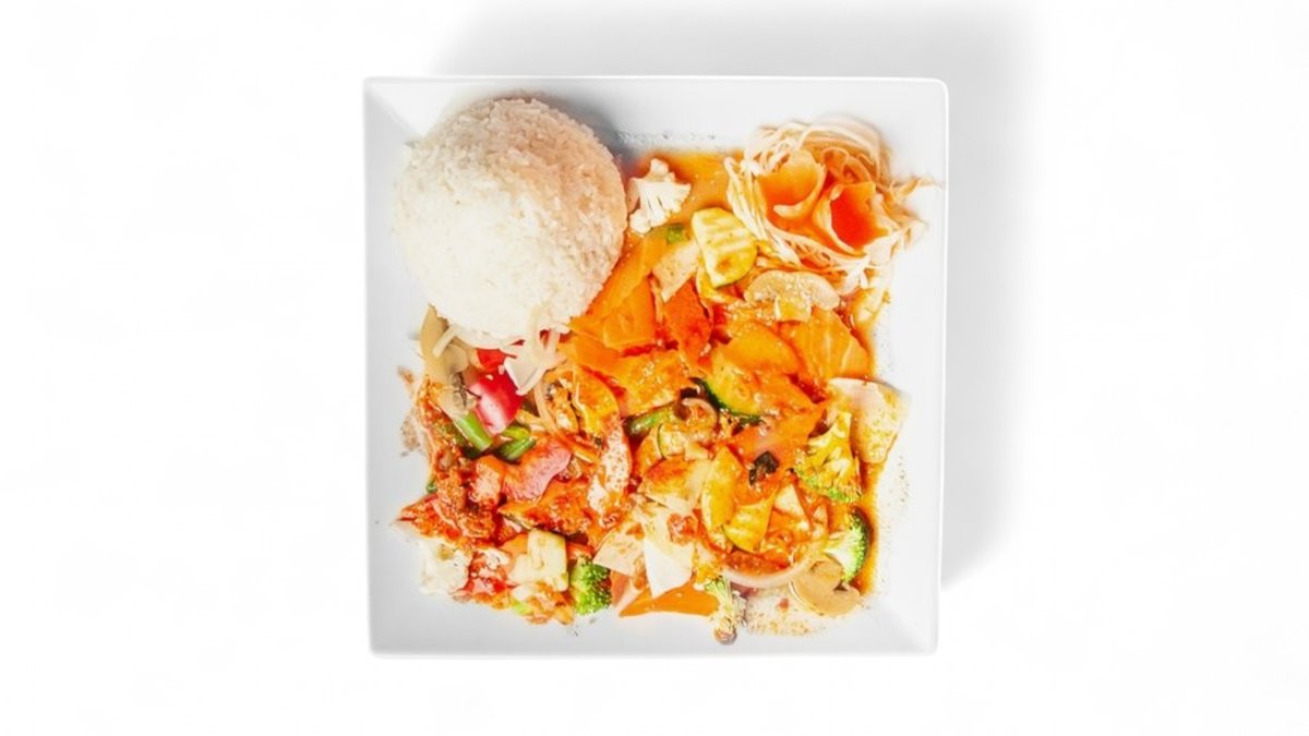 Kachní maso vařené v thajské červené kari omáčce s kokosovým mlékem a zeleninou, podávané s rýží. Exotické jídlo s jemně pikantní a krémovou chutí.(6.9)